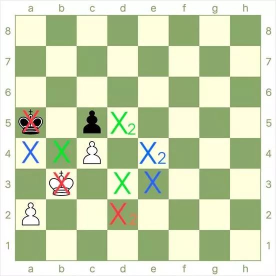 王的间隔总是奇数格,且双方的王都在颜色相同的格子之中。(如下图)