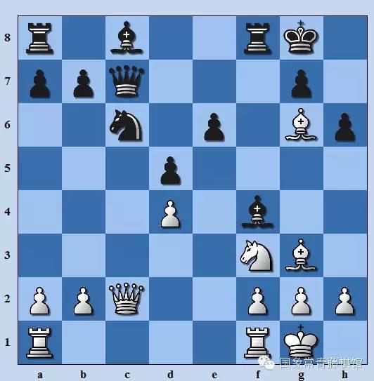 黑后吃掉白马,但是c3白兵双重攻击黑象和黑后。白方摆脱黑象牵制后可以吃回黑象。同时白棋c4白象和e5白马攻击着f7,局势激烈复杂。