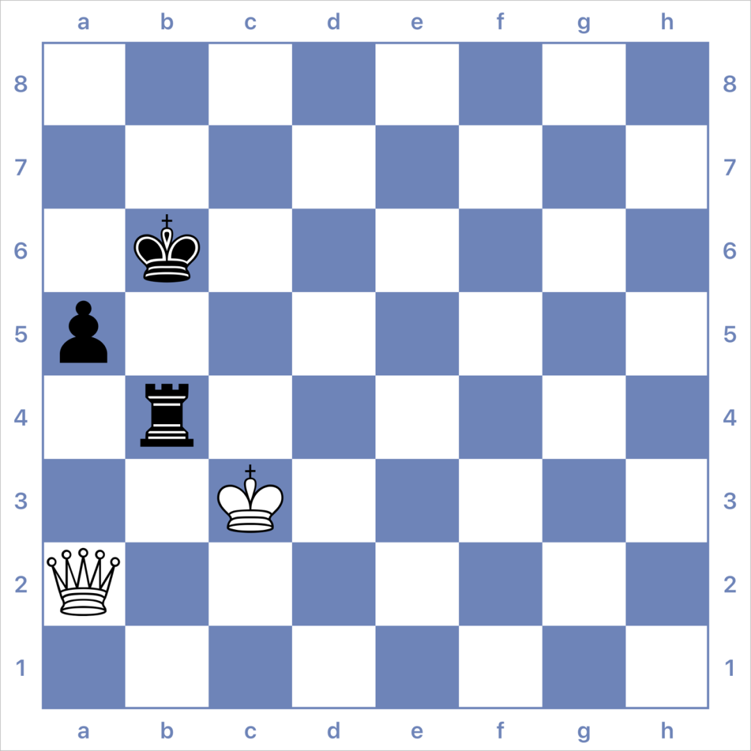 但在上述局面中,若将所有子力都往下移动一排(见下图),白方便可获胜。这是因为白方后在获得了第8横线的行动空间后,可以从后方骚扰黑王从而获得了新的进攻机会。具体走法大家可自行尝试。
