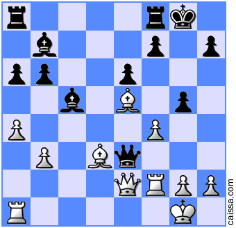 如图,双方下完第28回合,现由执白的安德森走棋,Qh7弃后,五步杀王(如下是其中一种杀法)